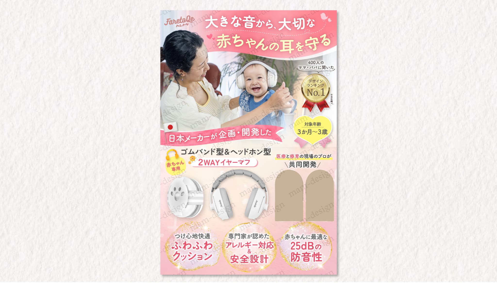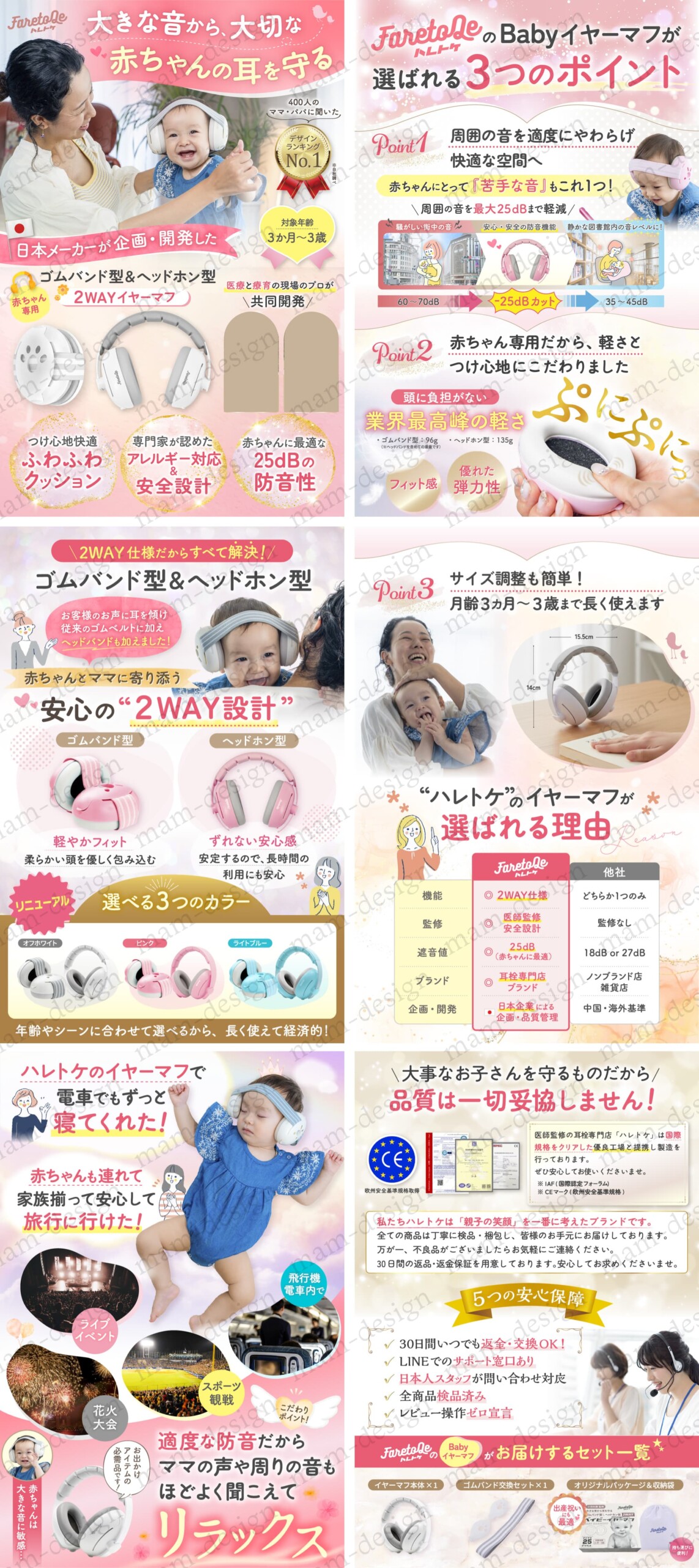 Amazon画像(かかとパッド3WAY) Amazonサブ画像(2~6枚) Amazon画像(赤ちゃん用2WEYイヤーマフ) クライアント様のご要望をもとに、赤ちゃんがいるママ向けに柔らかい雰囲気と目に止まるようなかわいらしさを加えたデザインにいたしました。 メインカラーはピンク色を採用し、デザイン性だけでなく商品のメリットや機能性をわかりやすく伝わるようあしらいも工夫して作成いたしました。 CATEGORIESEC画像PRODUCTAmazon画像DATE2025.10